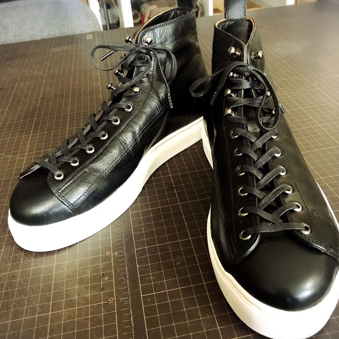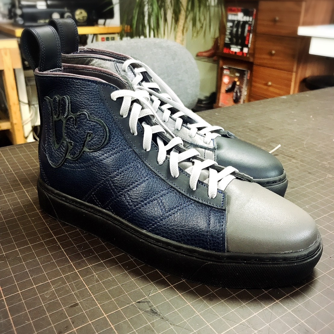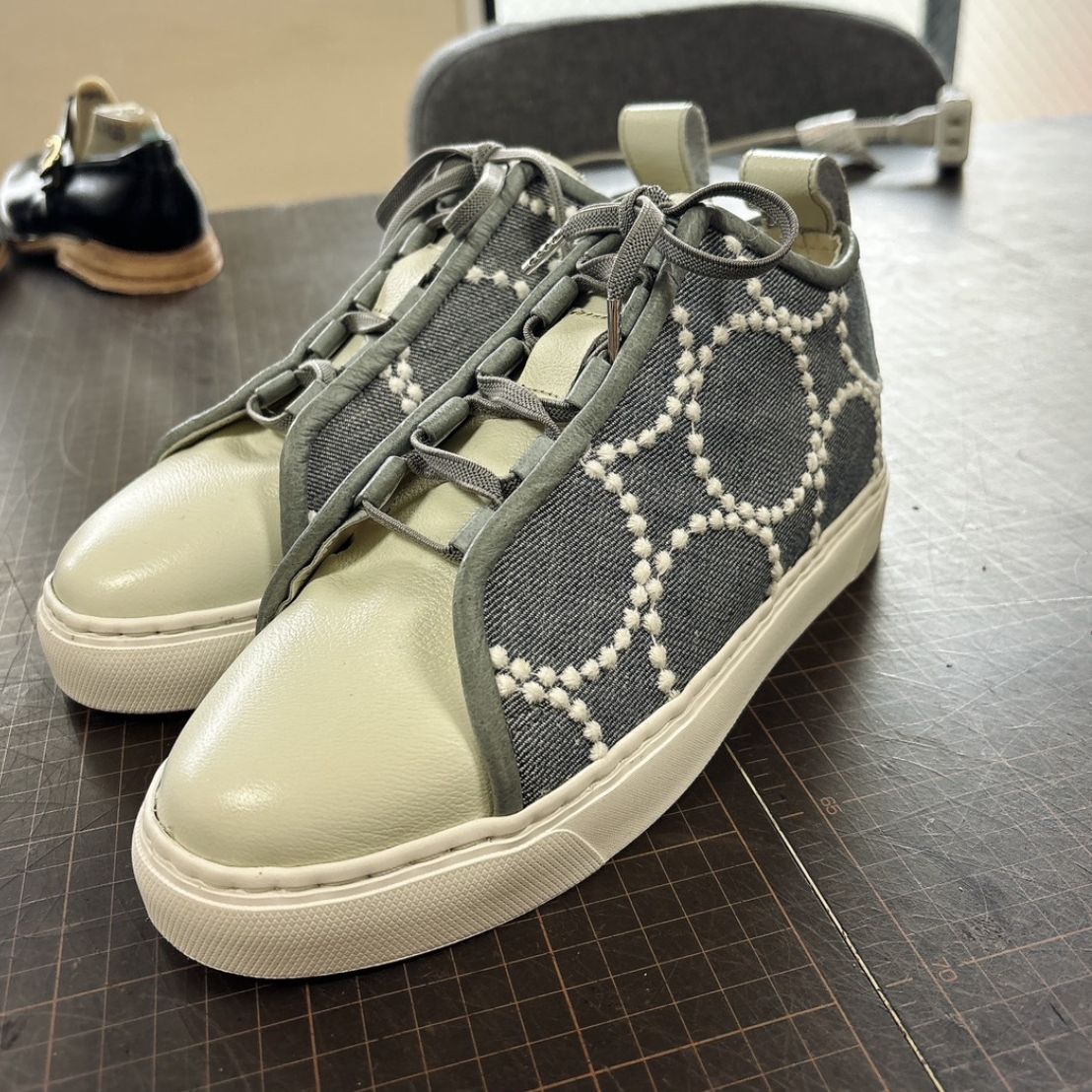 7.製甲作業、スクールにある革を自身で選択し、ミシン、革漉き機を使用したアッパー製作